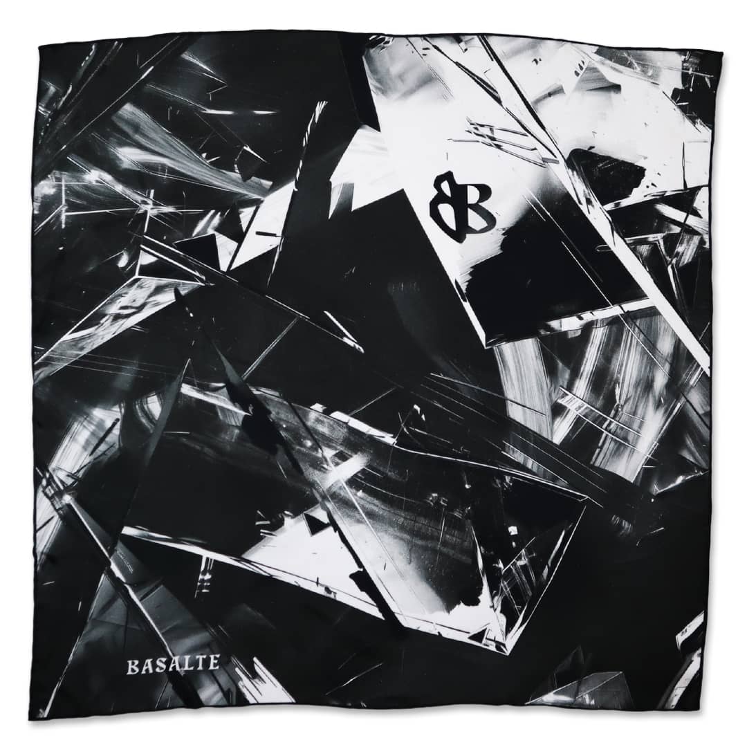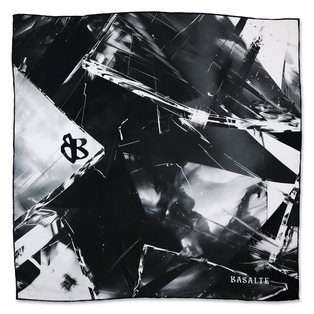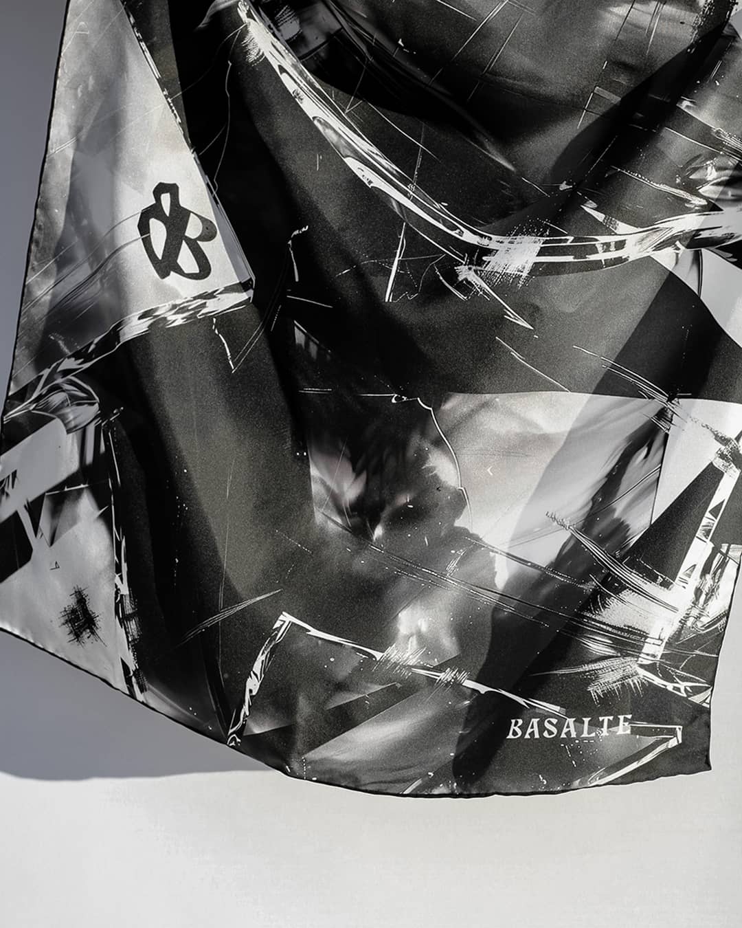 Un carré en twill de soie de 65 cm sur 65 cm, noir et blanc, comme un talisman — un détail portant les germes du dépassement.