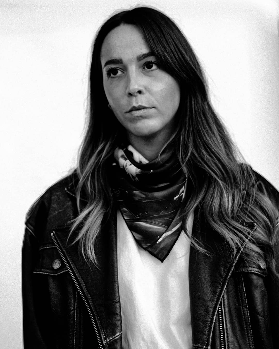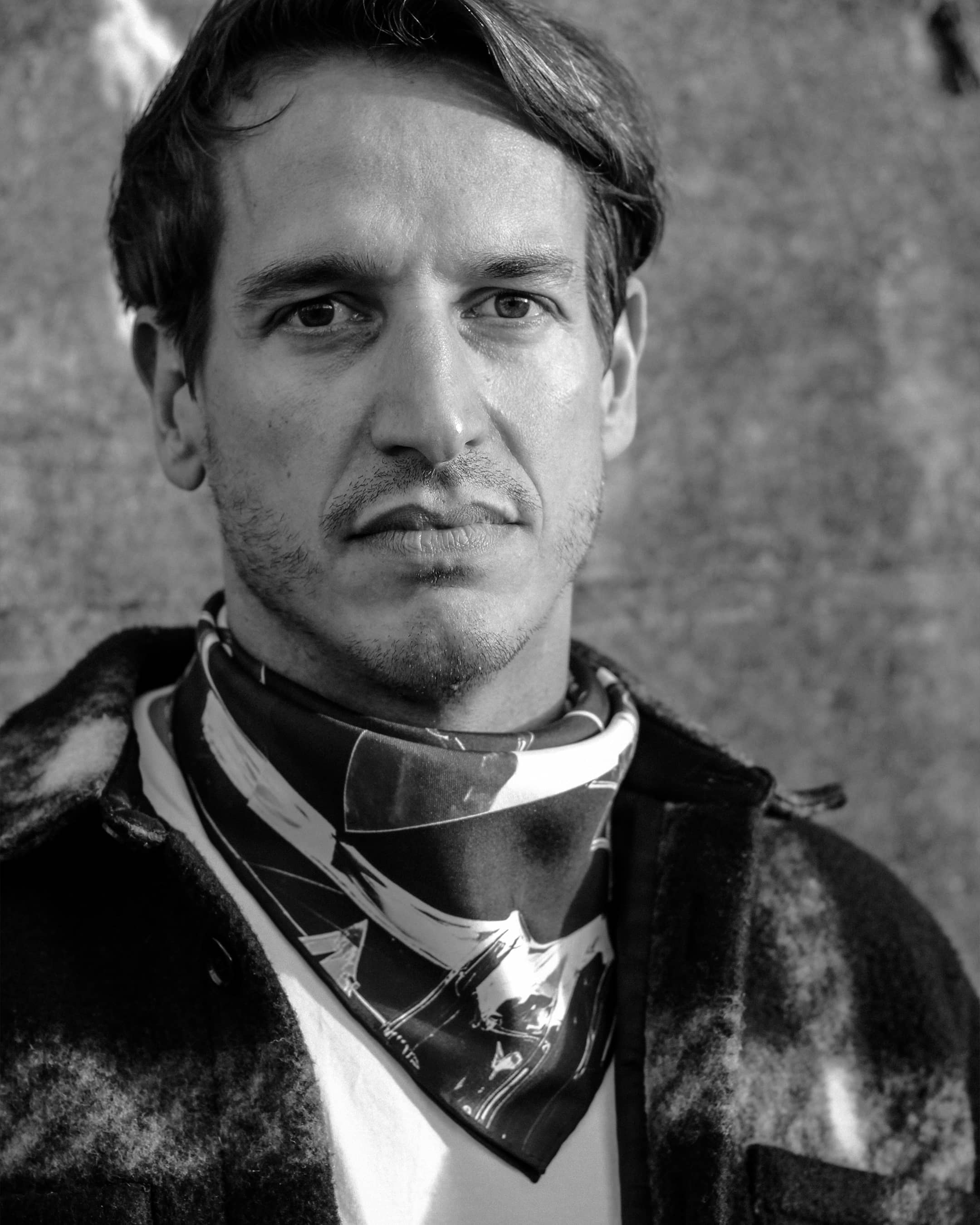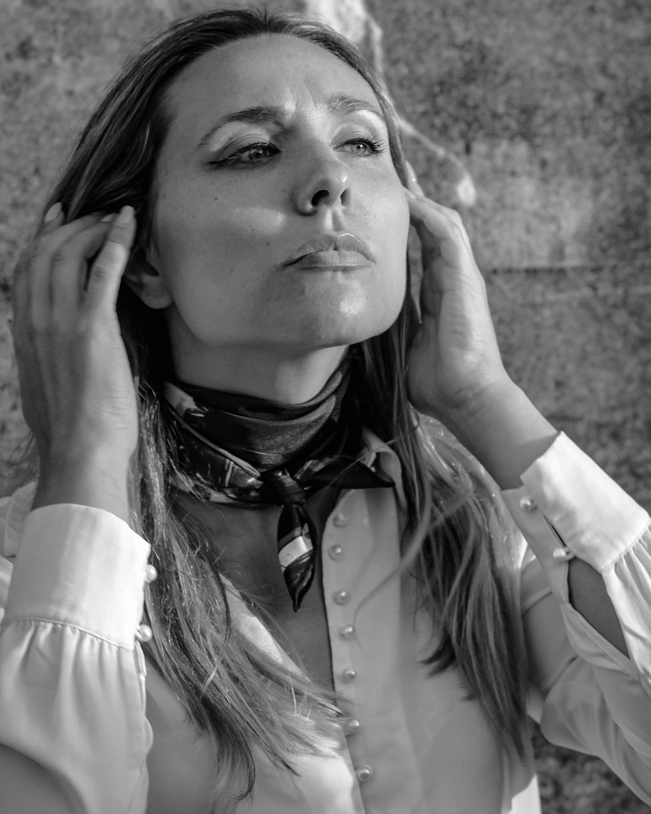Un carré en twill de soie de 65 cm sur 65 cm, noir et blanc, comme un talisman — un détail portant les germes du dépassement.