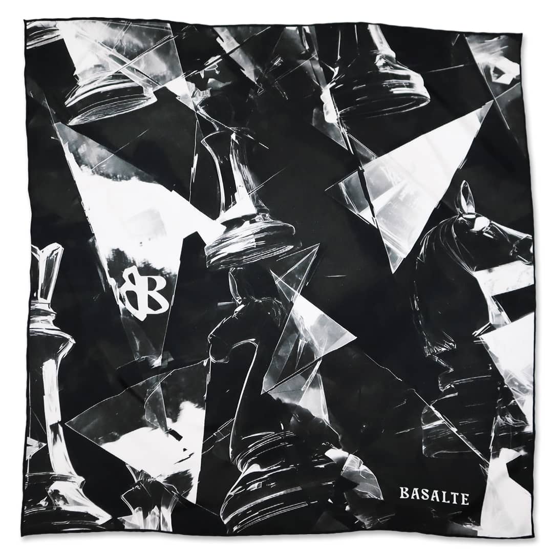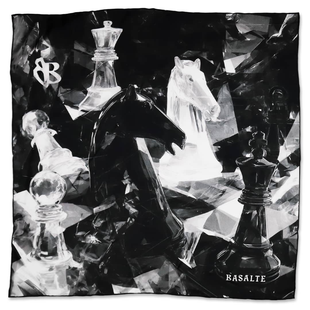 Quatre foulards en twill de soie de 65cm x 65 cm, avec deux séries : Bris de Glace, puis Échec et mat.